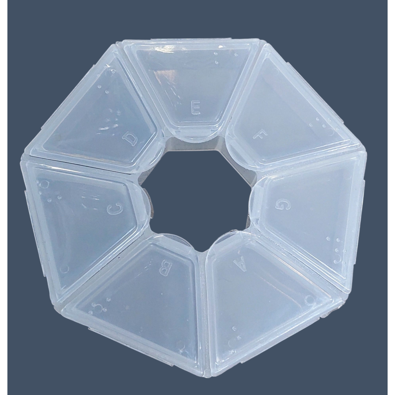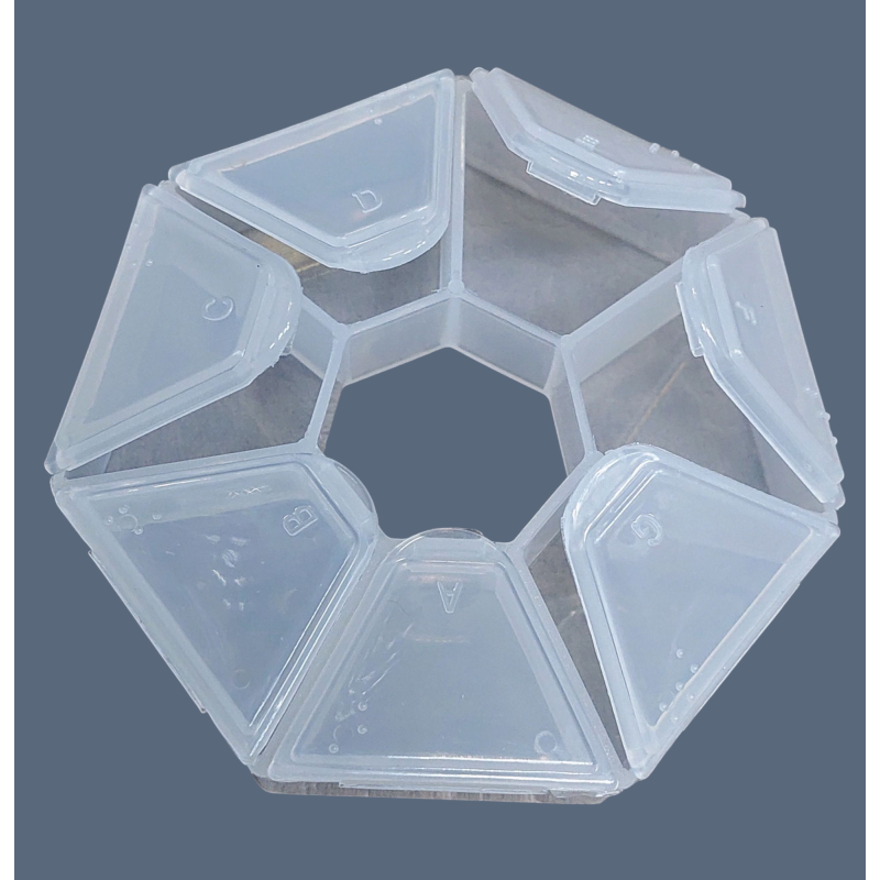 Контейнер имеет 7 секций с отдельными крышками. Корпус изготовлен из прозрачного пластика, что позволяет видеть содержимое.