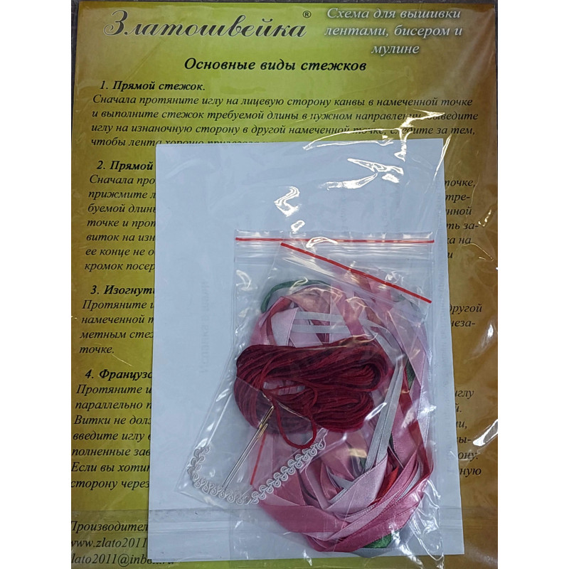 В набор входит: ткань с нанесенным полноцветным рисунком,инструкция с подробным описанием основных стежков лентами.