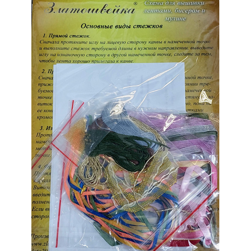 В набор входит: ткань с нанесенным полноцветным рисунком,инструкция с подробным описанием основных стежков лентами.