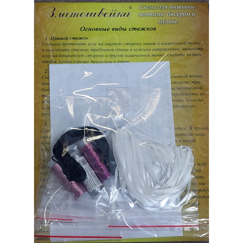 В набор входит: ткань с нанесенным полноцветным рисунком,инструкция с подробным описанием основных стежков лентами.