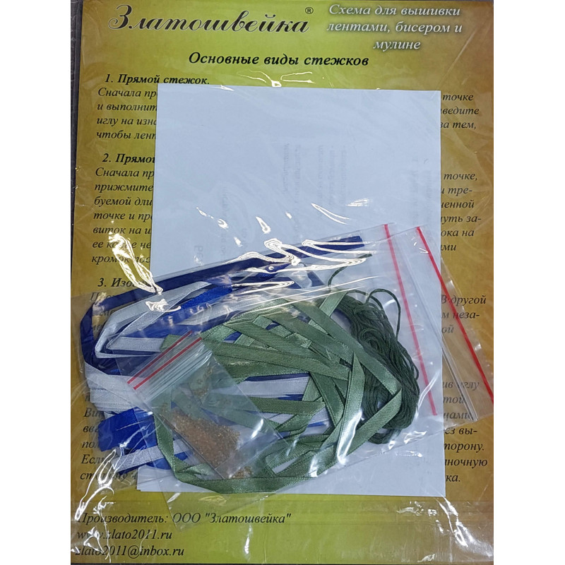 В набор входит: ткань с нанесенным полноцветным рисунком,инструкция с подробным описанием основных стежков лентами.
