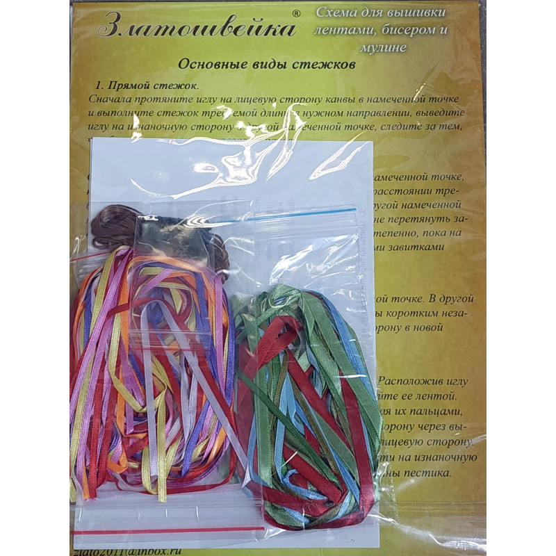 В набор входит: ткань с нанесенным полноцветным рисунком,инструкция с подробным описанием основных стежков лентами.